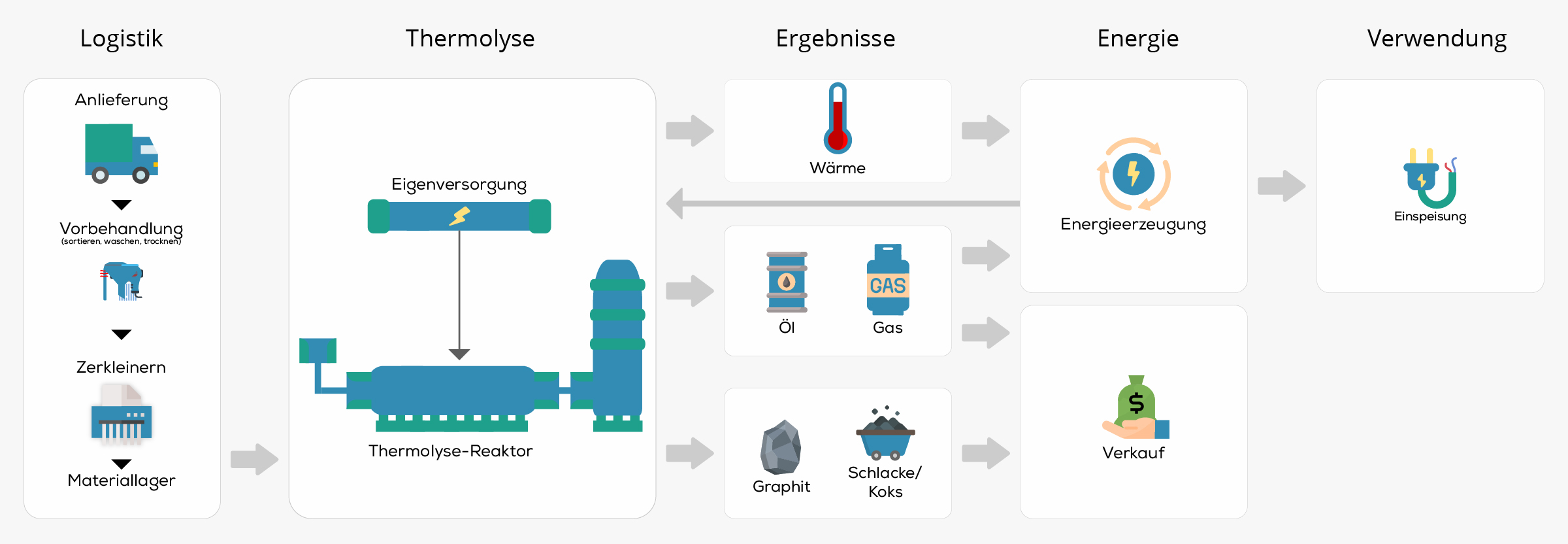 Thermolyse ist ein wärmebasierter, chemischer Prozess, bei dem kohlenstoffhaltige Ausgangsstoffe mit Temperaturen von über 400 Grad Celsius, unter Ausschluss von Sauerstoff, aufgespalten werden. Diese werden sodann in nachgelagerten Bearbeitungsprozessen zu industriellen Werkstoffen veredelt und damit industriell erneut einsetzbar.